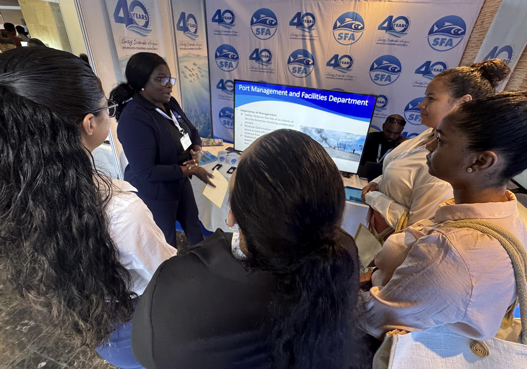In tandem with the conference proceedings, an engaging exhibition was organized, providing a platform for participants to showcase and promote their diverse products and services. The SFA set up an interactive stall that drew considerable attention, manned by a dedicated team comprising Mrs. Christianne Sultan, Mr. Antoine Barbe, and Mr. Ronny Alcindor. They eagerly welcomed visitors from various countries and local institutions, offering insight into the SFA’s initiatives and maritime activities.